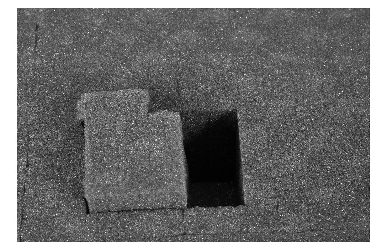 Внутреннее пространство чемодана заполнено предварительно вырезанной губкой, подготовленной для самостоятельного моделирования полостей под конкретные продукты, например, инструменты, фототехнику или измерительную технику.