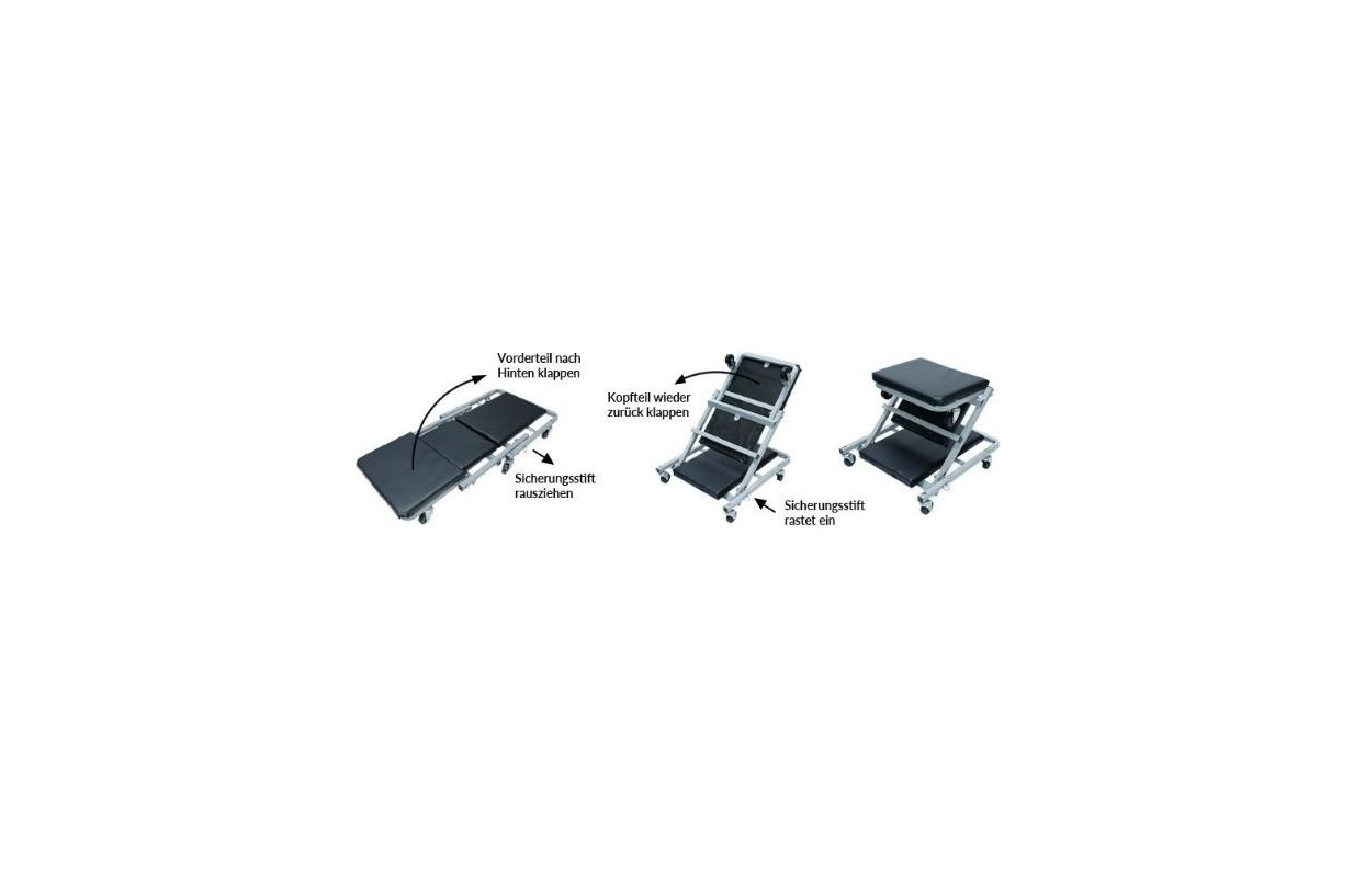 • Кушетка для мастерских с функцией сиденья для мастерских 2-в-1. Каркас из металла, сиденье из приятного и прочного пластика. Он оснащен 6 вращающимися колесами на подшипнике, что значительно облегчает его маневрирование. Одним движением мы можем превратить его в практичное удобное сиденье для мастерской.