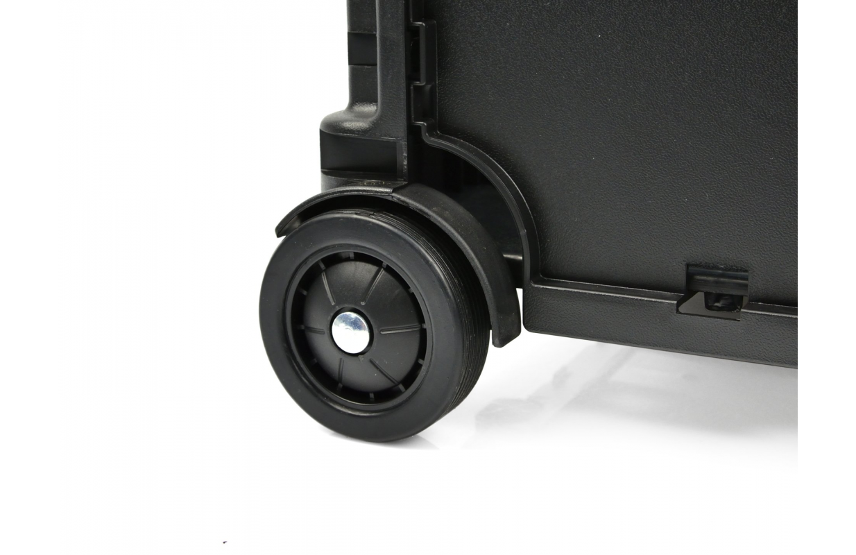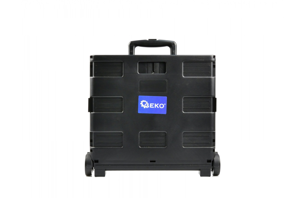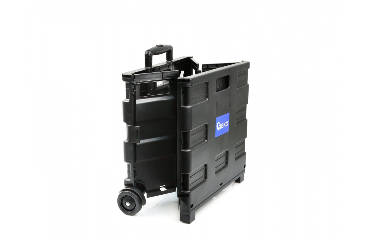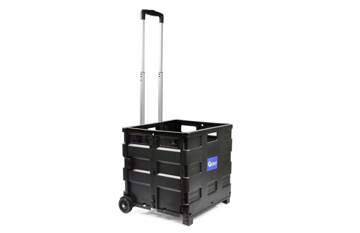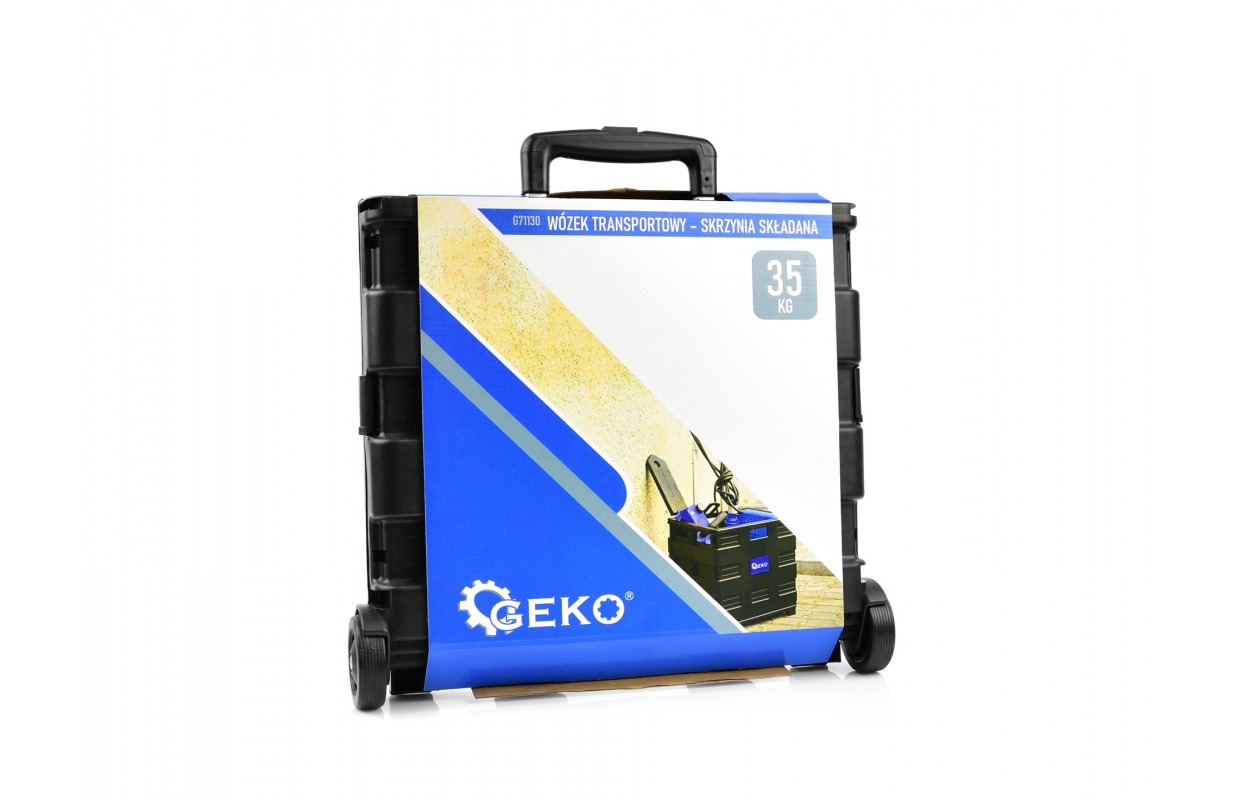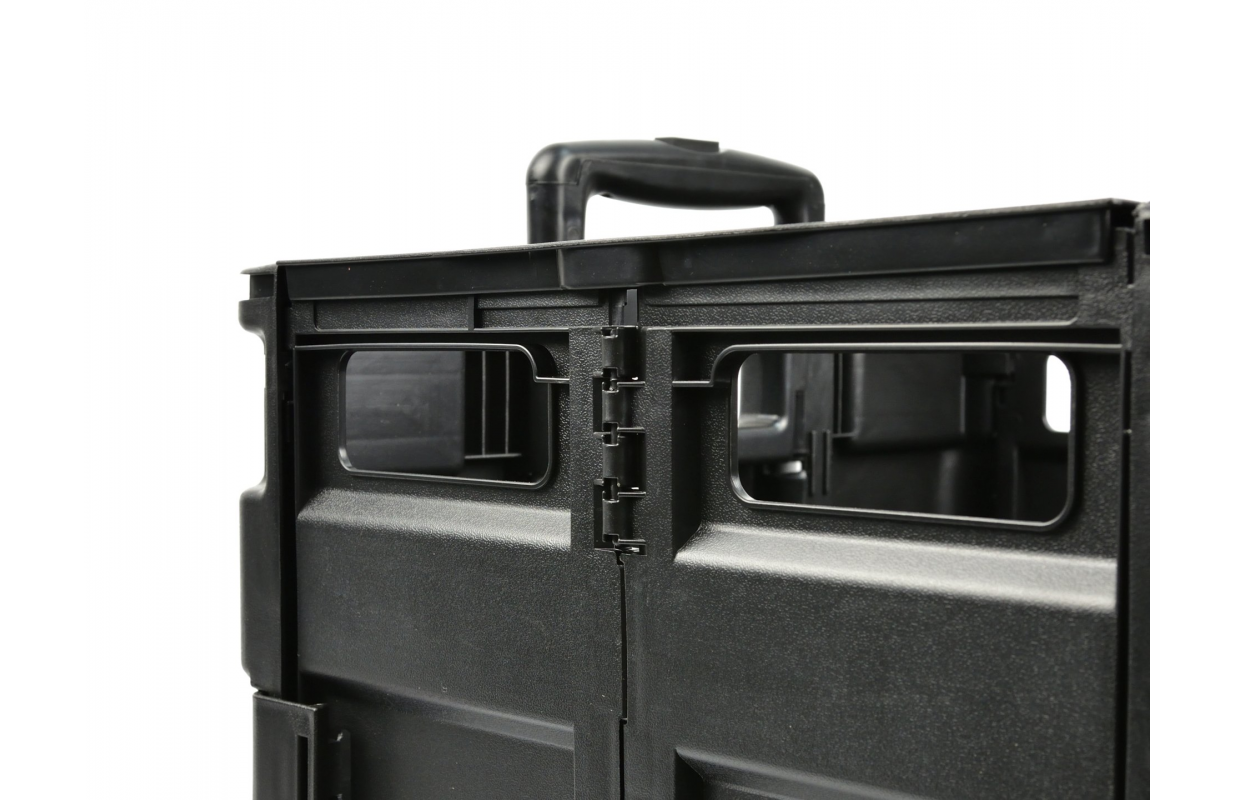 Складная транспортировочная тележка представляет собой высокоуниверсальную тележку, которая позволяет легко перевозить различные виды предметов общим весом не более 35кг. После складывания коляска занимает мало места, поэтому ее можно с успехом хранить, например, в багажнике автомобиля. Он имеет дополнительные полосы жесткости на боковых стенках коробки, рейки нужно просто снять со дна коробки и приложить к верхнему краю стенок. Оснащен телескопической ручкой, регулируемой по двум высотам.