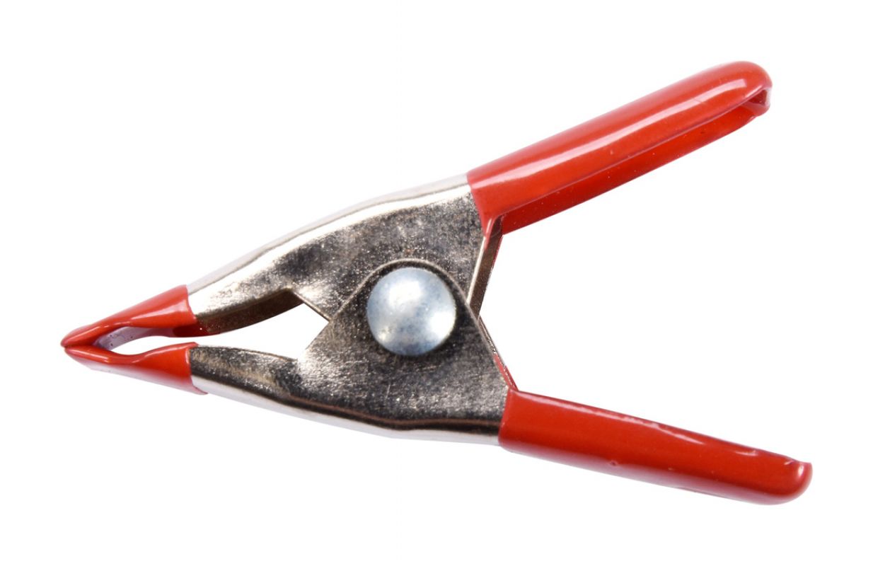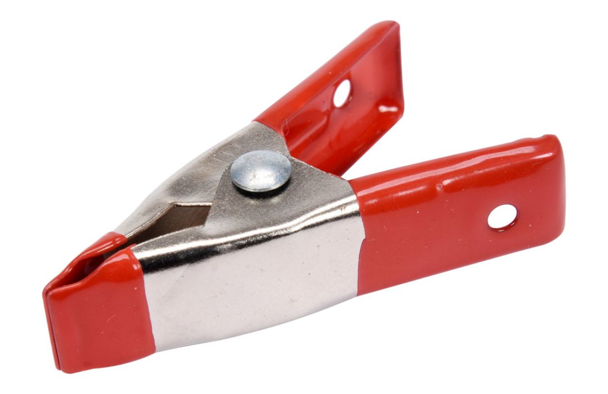 Металлический пружинный зажим с высокой силой сжатия. Изготовлен из оцинкованной листовой стали, рабочие наконечники и ручки покрыты слоем красного винила. Общая длина 55 мм, раскрытие 20 мм, глубина 20 мм. Для быстрого и прочного зажима материала во время обработки.