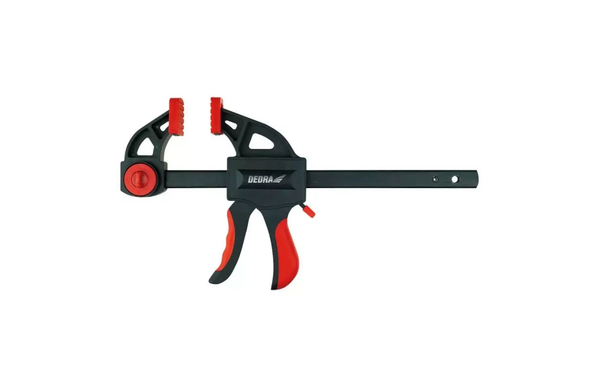 Пистолетная столярная струбцина предназначена для фиксации, удержания, склеивания таких материалов, как дерево, ДСП, фанера или пластик. Струбцина имеет стальную направляющую и быстрораздвижные губки. Губки и ручка изготовлены из высококачественного пластика с добавлением нейлона. Струбцина оснащена кнопкой быстрого снятия губок. Большим преимуществом пистолетных зажимов является то, что ими можно управлять одной рукой. Зажим оснащен дополнительной рабочей функцией, т.е. функцией отжима. Настройка струбцины занимает всего несколько секунд, и вы можете использовать распорку, например, при сборке дверных коробок.