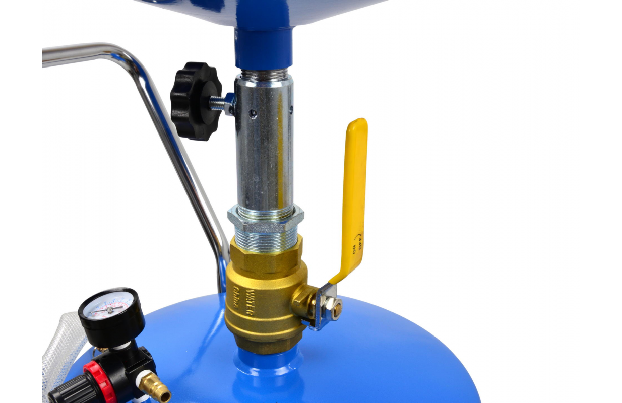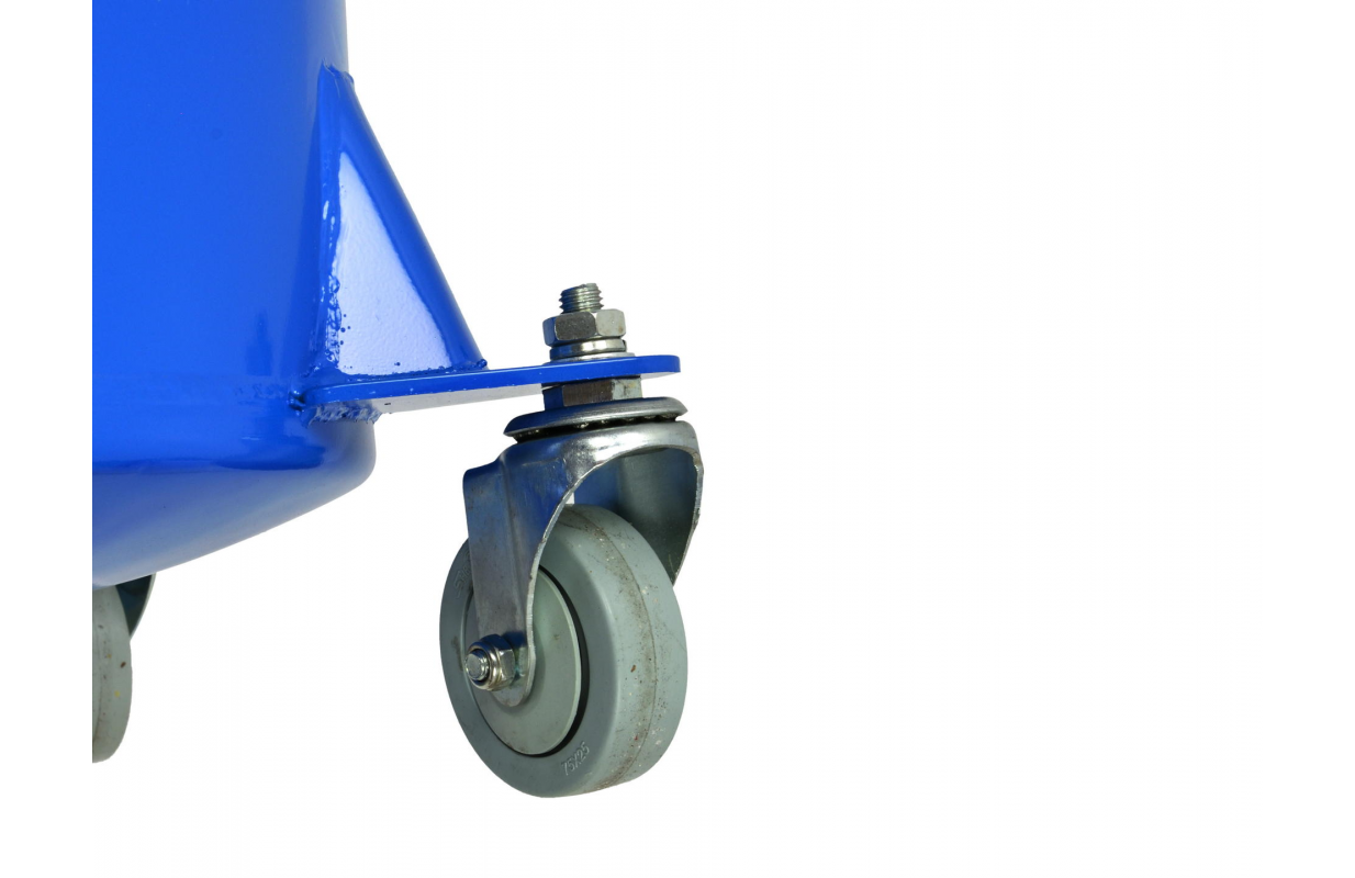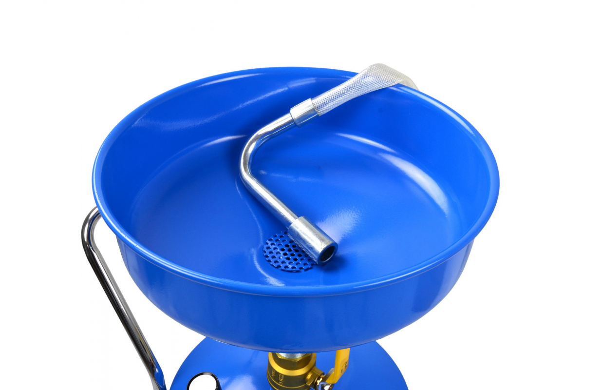 Передвижная установка объемом 80 л и воронка для сбора с широкой, круглой, противоразбрызгивающей поверхностью из окрашенной стали на 10 л. Можно увеличить поверхность сбора за счет ободка, фиксируя его на краях воронки.
