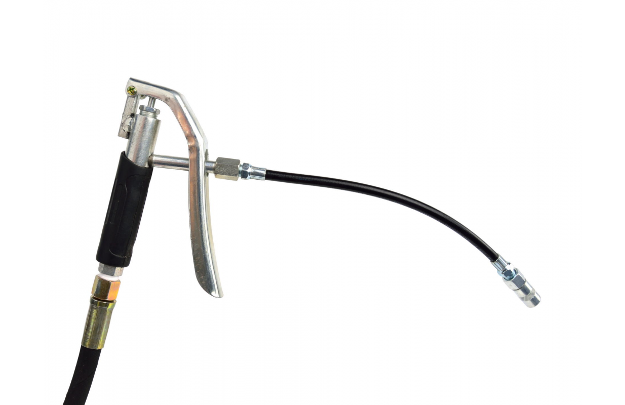 Шланг для смазочного шприца длиной 1,8 метра с установленным гибким шлангом со стандартным концевым фитингом, подходящим для большинства каламитов.