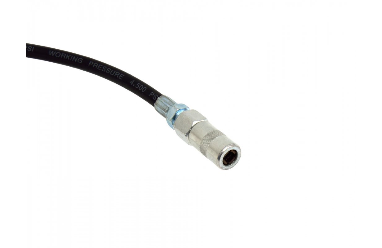 Шланг для смазочного шприца длиной 4 метра с установленным на пистолете гибким шлангом со стандартным концевым фитингом, к которому подходит большинство каламитов.
