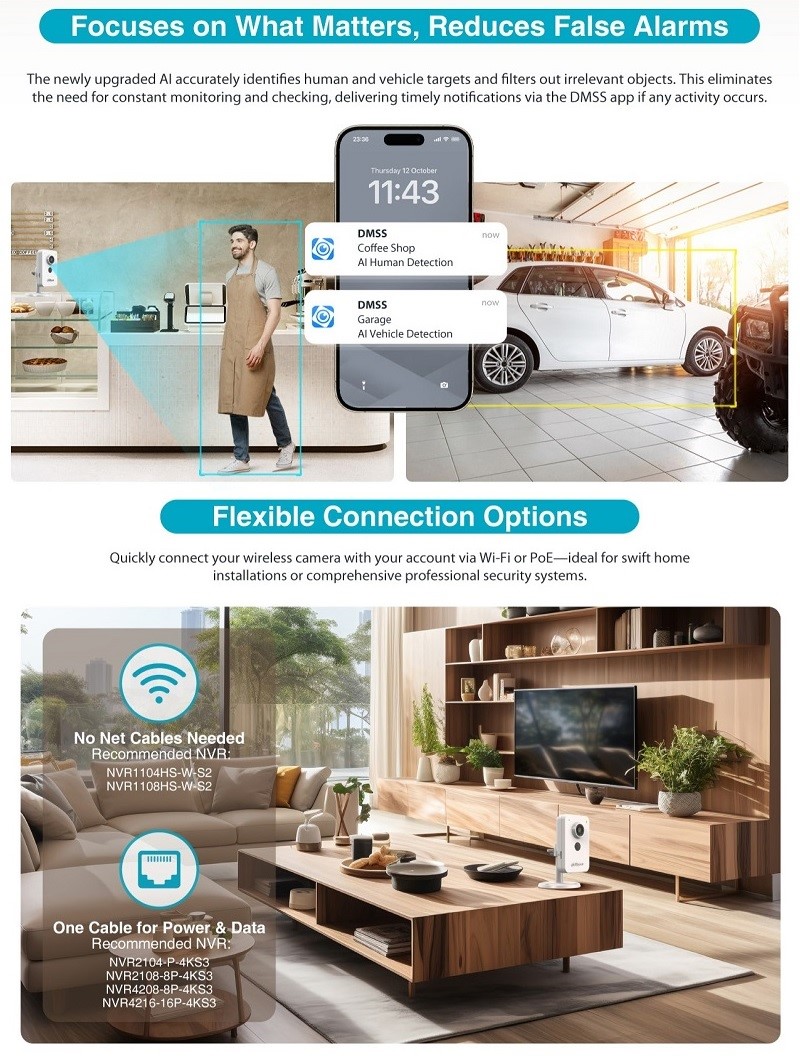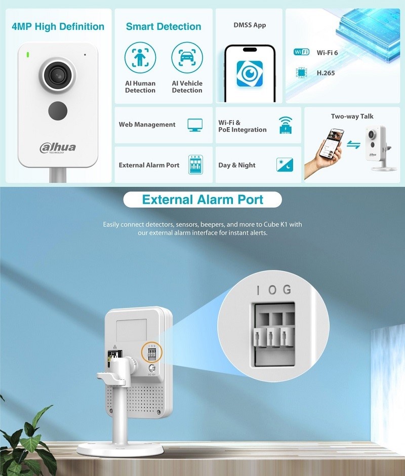 Камеры серии Cube не только просты в установке и эксплуатации, но и отличаются превосходной производительностью и экономичностью. Они создают чёткие, детальные изображения в высоком разрешении и предлагают мощные функции, включая функцию обнаружения человека с помощью искусственного интеллекта, режим конфиденциальности и двустороннюю связь. Информация синхронно отправляется на ваш телефон, чтобы вы были в курсе событий. Эти камеры широко используются в небольших и средних помещениях, например, в небольших розничных магазинах. Матрица изображения: 1/3" CMOS. Макс. разрешение: 2560 (Г) x 1440 (В). Дальность подсветки: до 30 м (98,43 фута) (ИК). Количество осветителей: 1 (ИК-светодиод). Регулировка угла: Поворот: от 0° до 360°; Наклон: от -10° до 100°. Фокусное расстояние: 2,8 мм. Макс. диафрагма: F2.0. Угол обзора: Г: 92°; В: 50°; Г: 107°. Обнаружение человека: Да. Сжатие видео: H..265; H.264; H.264H; H.264B; MJPEG (поддерживается только дополнительным потоком). Частота кадров видео: Основной поток: 4M (2560 x 1440)@(1-25 кадров/с); дополнительный поток: 640 x 360@(1-25 кадров/с). Разрешение: 4M(2560 x 1440; nHD (640 × 360). Битрейт видео: H.264: 24–6144 Кбит/с; H.265: 9–6144 Кбит/с. День/Ночь: Авто (ICR)/Цветной/Ч/Б. WDR: есть. Детектор движения: ВЫКЛ./ВКЛ. (4 области, прямоугольные). Поворот изображения: 0°/180°. Встроенный микрофон: есть. Встроенный динамик: есть. Сжатие звука: PCM; G.711a; G.711Mu. Сигнализация аномального звука: есть. Сетевой порт: RJ-45 (10/100 Base-T). Wi-Fi: IEEE 802.11b/g/n/ax; 2,412–2,472 ГГц. Хранилище: карта Micro SD (до 256 ГБ). Программное обеспечение для управления: DMSS; Smart PSS Lite. Мобильный клиент: iOS; Android. Питание: 12 В постоянного тока/PoE. Потребляемая мощность: базовая: 2,04 Вт (12 В постоянного тока); 4,7 Вт (PoE), макс. 2,89 Вт (12 В постоянного тока); 5,85 Вт (PoE). Рабочая температура: от –10 °C до +45 °C (от +14 °F до +113 °F). Рабочая влажность: ≤95% (относительная влажность), без конденсации. Материал корпуса: пластик. Кнопка камеры: кнопка сброса. Размеры изделия: 64 мм x 100 мм x 34 мм (2,52" x 3,94" x 1,34"). Вес нетто: 0,11 кг (0,24 фунт).